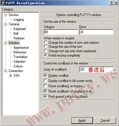 Putty窗口回滚,就是窗口可以保留最后多少条信息记录. 下面通过实例给大家演示 1.窗口输入:find usr / (在根目录下搜索关于usr的文件或文件夹) 2.修改回滚数:201,再来看下演示结果 这里我们可以看到,修改回滚数量之后,窗口保存的信息记录也会跟着改变,如果你要查看的信息比较多的话,不妨通过修改回滚数量来达到我们的要求.