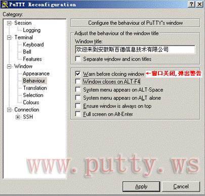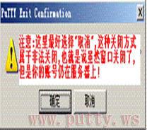 当我们点击窗口右上方的关闭按钮时,会弹出警告窗口,这里大家要注意,正常关闭窗口应该按住CTRL+d键,直接点“关闭“按钮属于非法关闭。 1.选中“Warn before closing window”选项 2.登陆主机并点击窗口右上方的“关闭“按钮 3.弹出警告窗口,询问是否关闭,这里点“取消“
