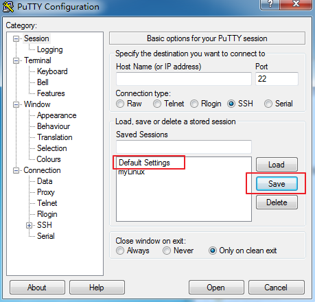 注意:如果一开始使用PuTTY的时候 没有配置默认的配置信息的话,可能 Sessions 文件下没有 Default%20Settings ,点击 Default Settings 选项,点击 Save 按钮,注册表里就生成了一个 Default%20Settings 文件: