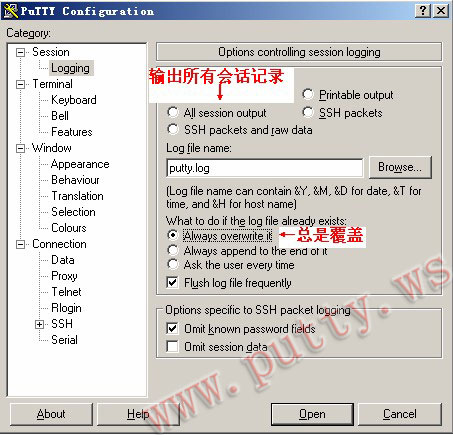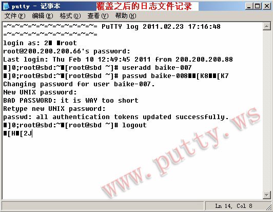 1.Putty日志文件中的总是覆盖(Always overwrite it)选项,选择此项后,新的日志文件会将原有的日志文件记录全部覆盖,请慎用! 2.下面通过演示界面来对比下 通过以上对比,可以明显看到,原有的日志文件记录已经被覆盖!