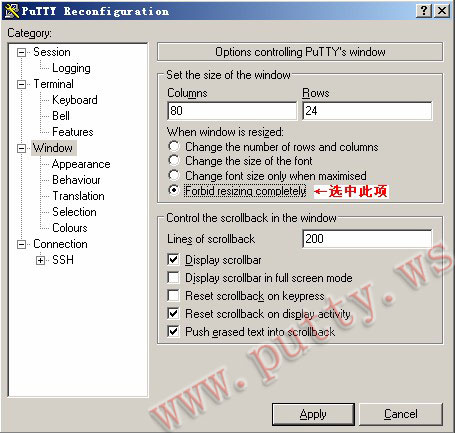 完全禁止大小改变(Forbid resizing completely),这里就比较简单了,如果选中此项,无论你把行、列设置多大,窗口的字体都不会改变,下面来看下对比 1.默认情况 2.选中”完全禁止大小改变”项后的演示结果 通过以上对比,默认和修改后的窗口大小,基本相同,此选项与默认选项结果一致
