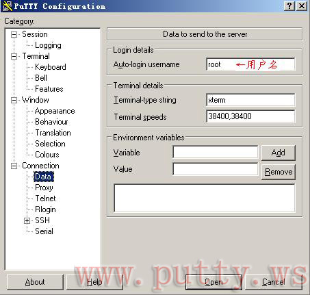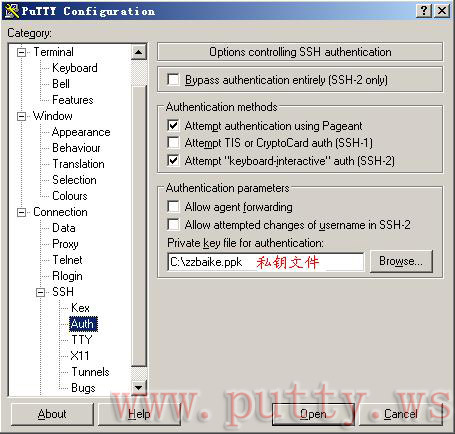 3.设置Putty登陆用户名、选择“c:\zzbaike.ppk”私钥文件,登陆主机.