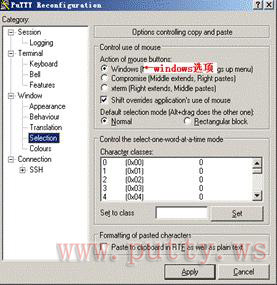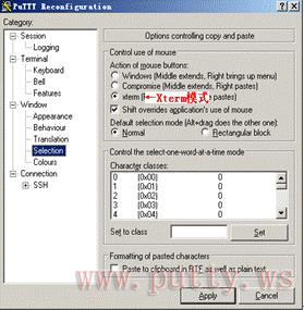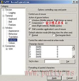 Putty鼠标按钮选项 通过鼠标按钮选项可以控制鼠标来进行复制、粘贴操作,选项包括: 1.Windows选项; 2.混合模式(系统默认选项); 3.Xterm模式. 以上是三种模式选项的简单介绍,下面我们逐一的来学习。