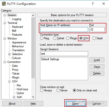 在 Putty Configuration 窗口中,输入以下内容。如下图所示: