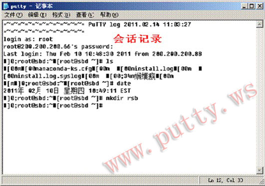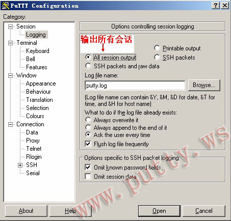 1.会话日志记录:管理员对远程主机进行的日常管理、操作等记录,可以有效的帮助管理员回忆所做的哪些操作。 这里需要注意的是,Putty默认情况下是不记录会话操作的,想要将操作记录输出到日志文件中,必须要选中下面这个选项,不然的话,日志文件虽然存在,但是里面是没有内容的。 2.日志文件名:用于保存会话日志记录的文件名称,可以使用系统默认的Putty.log,也可以自己定义.