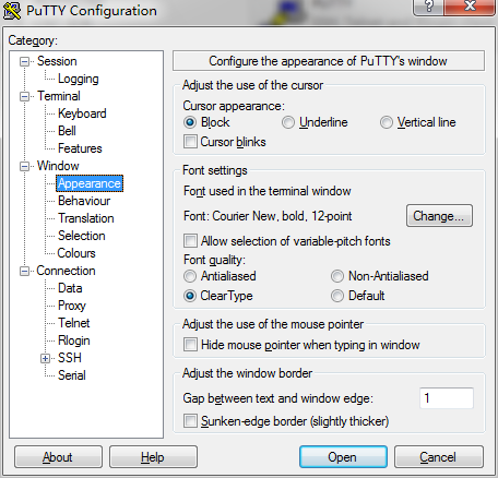 双击即可运行Putty,在Host Name(or IP address)输入目标主机的IP地址,点击Open即可连接。